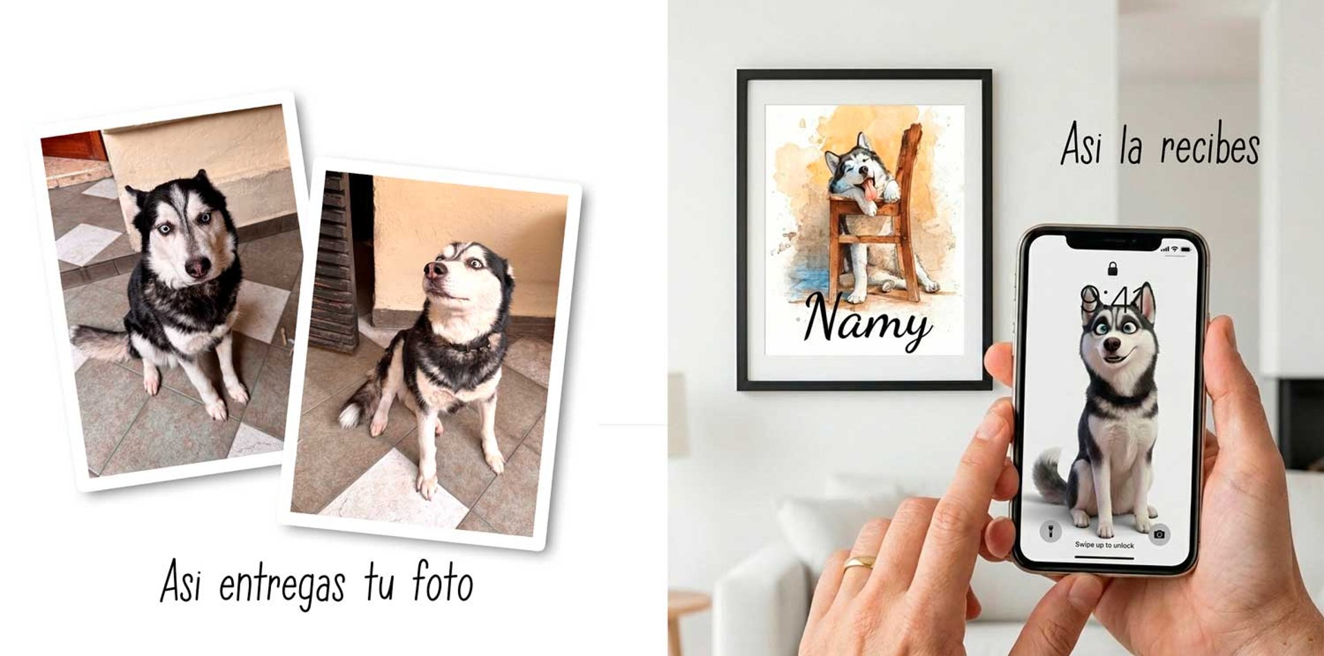 Una foto congela un momento. Una ilustración personalizada captura su esencia: esa mirada cuando te ven llegar, esa pose que solo ellos tienen, esa energía que nadie más entiende. Usamos tecnología digital de ilustración apoyada con IA para crear la base artística, y luego refinamos cada detalle manualmente para reflejar la personalidad que tú conoces. Tú nos cuentas cómo son. Nosotros lo convertimos en arte digital para compartir o impreso para cualquier lugar de tu casa.